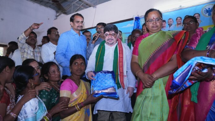 గ్రామాల్లో ఇంటింటికి వెళ్ళి బొట్టుపెట్టి మహిళా సంఘాల వాళ్ళు చీరలు సారే పంపిణీ పెడుతున్నార