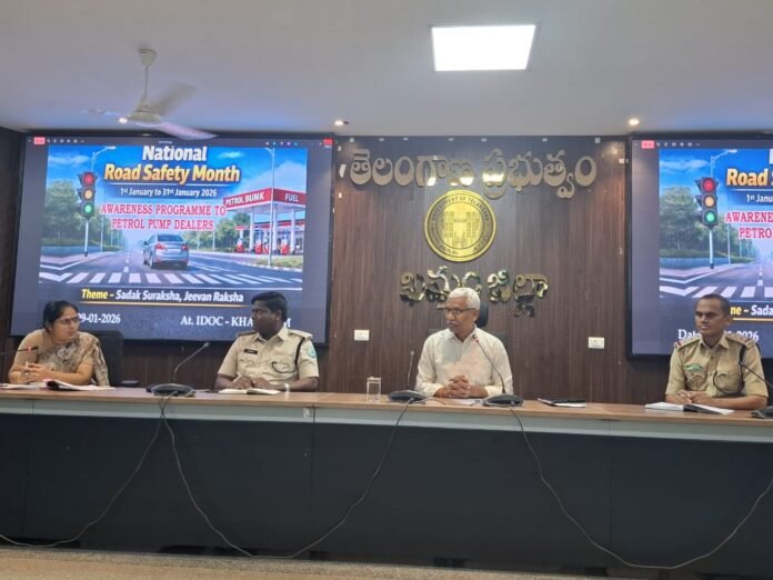 పెట్రోల్ బంక్ కు 100 మీటర్ల దూరంలో రోడ్డుపై బ్లింకర్స్, రంబుల్ ష్ట్రిప్స్ ఏర్పాటురోడ్డు భద్రత ప్రమాణాలపై పెట్రోల్ బంక్ నిర్వాహకులకు నిర్వహించిన అవగాహన కార్యక్రమంలో పాల్గొన్న అదనపు కలెక్టర్ రోడ్డుపై ప్రమాదాల నియంత్రించడం ప్రతి ఒక్కరి బాధ్యతగా భావించాలని అదనపు కలెక్టర్ పి. శ్రీనివాస్ రెడ్డి అన్నారు.
