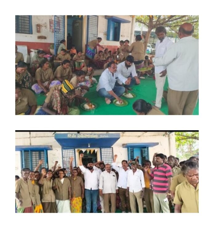 మూడు నెలలుగా వేతనాలు అందక పారిశుద్ధ్య కార్మికులు తీవ్ర ఆర్థిక ఇబ్బందుల్లో కూరుకుపోయారు. పండుగ సమయం సమీపిస్తున్నప్పటి కీ చేతిలో చిల్లిగవ్వ లేక ఆకలితో అలమటిస్తున్న కార్మికులు సోమవారం స్థానిక గ్రామ పంచాయతీ కార్యాలయ ఆవరణలో ఏఐటీయూసీ ఆధ్వర్యంలో నిరసన చేపట్టారు.ఈ సందర్భంగా కార్యాలయ ఆవరణలో పొయ్యిలు రాజేసి ‘వంటా-వార్పు’ కార్యక్రమం నిర్వహిస్తూ తమ ఆవేదనను వ్యక్తం చేశారు. గ్రామాల్లో పారిశుద్ధ్యం కుంటుపడకుండా రాత్రింబవళ్లు కష్టపడుతున్నప్పటికీ మూడు నెలలుగా జీతాలు ఆపడం అన్యాయమని కార్మికులు ఆగ్రహం వ్యక్తం చేశారు.ఏఐటీయూసీ జిల్లా సెక్రెటరీ రేతారి రాధాకృష్ణ, శ్రీకాళహస్తి గౌరవ అధ్యక్షులు వై.ఎస్. మణి, మండల కార్యదర్శి కార్తిక్ మాట్లాడుతూ… పెండింగ్లో ఉన్న మూడు నెలల వేతనాలను తక్షణమే విడుదల చేయాలని డిమాండ్ చేశారు. పండుగ బోనస్తో పాటు బకాయిలన్నీ ఒకేసారి చెల్లించాలని, కార్మికుల సమస్యలపై పంచాయతీ అధికారులు నిర్లక్ష్యం వీడాలని కోరారు.తమకు న్యాయం జరిగే వరకు నిరసన విరమించబోమని, అవసరమైతే మండల కేంద్రంలో ఆందోళన ఉధృతం చేస్తామని కార్మికులు హెచ్చరించారు. ఈ కార్యక్రమంలో ఏఐటీయూసీ ప్రతినిధులు, పారిశుద్ధ్య కార్మికులు పాల్గొన్నారు.