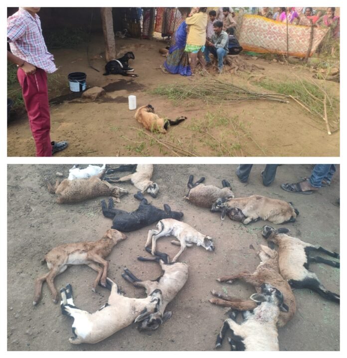 మర్పడ గ్రామానికి చెందిన పిండి నారాయణ గొర్రెలు, మేకలు కాస్తూ కుటుంబాన్ని పోషించుకుంటున్నాడు. ప్రతిరోజులానే ఉదయం జీవాలకు మేత పెట్టి అడవికి వెళ్లగా, మధ్యాహ్నం సమయంలో ఆయన కుమారుడు స్వామి ఇంటికి వచ్చి చూసేసరికి గొర్రెల కొట్టం వద్ద కుక్కలు పరుగులు తీస్తూ కనిపించాయి. వెంటనే కొట్టంలోకి వెళ్లి పరిశీలించగా సుమారు ముప్పై గొర్రె, మేక పిల్లలు మృతిచెందినట్లు గుర్తించారు.